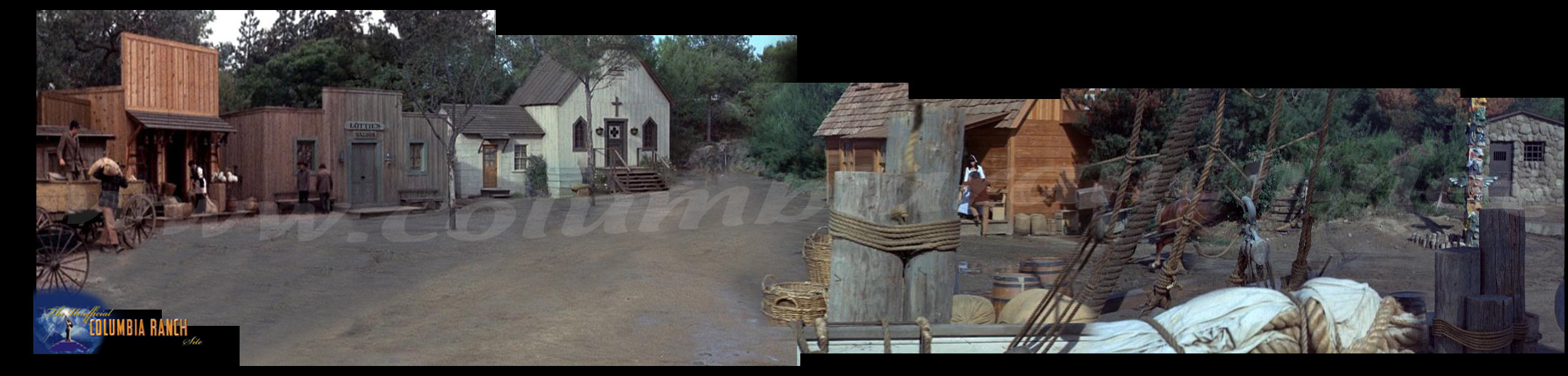 The Brides set underwent numerous changes and additions throughout its 2 seasons run. The Church was originally angled at a 12 o'clock position (looking from the same view as above image) but was relocated at a 11 o'clock for a better perspective. It also gained a small addition to the left side. Lottie's originally was a small single story Saloon, but in the second season it was turned in to a 2 story building. Main reason for this was to hide the visibility of the Sound Stage 30 behind it, which was so noticeable in the first season. The General store was rebuild from the ground up and the structures to the left of it were strategically connected to it so to obscure visibility of Stage 29.